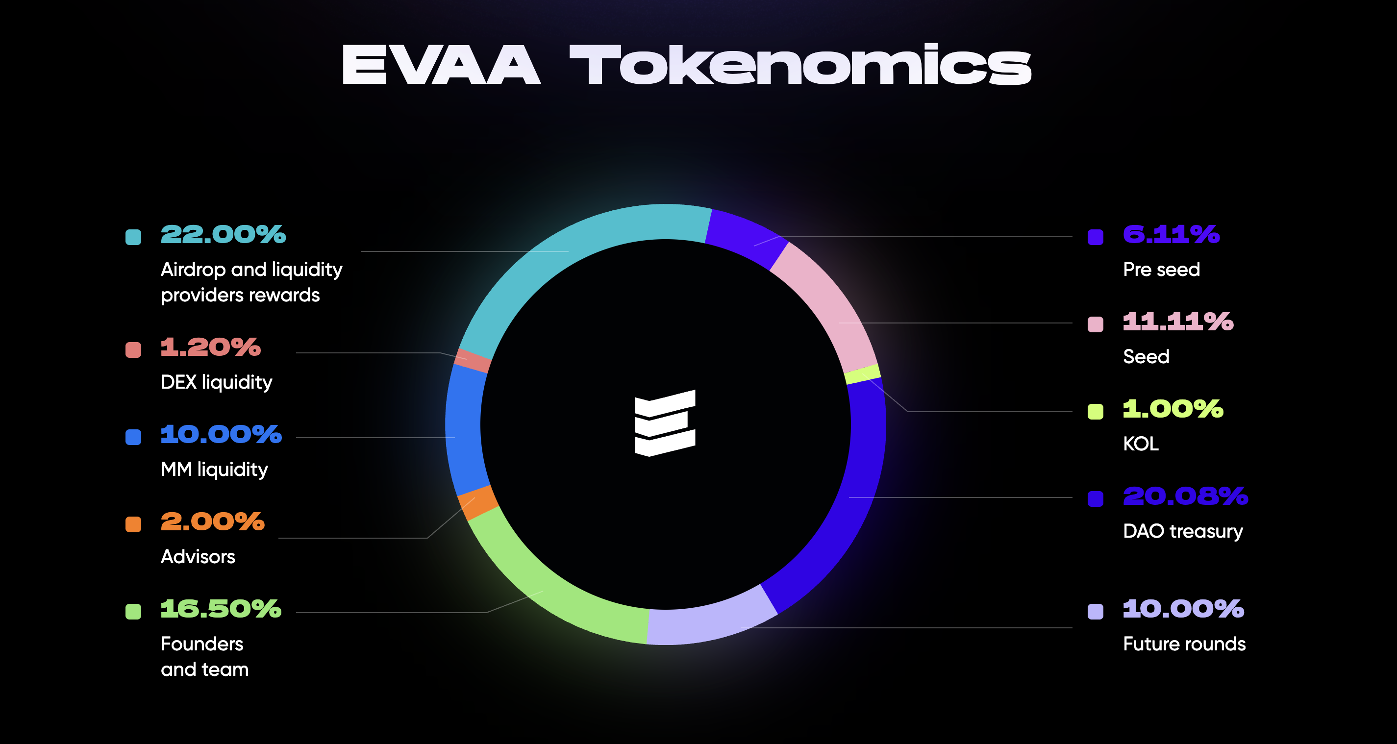 The maximum supply of EVAA is 50,000,000 (50 million) tokens, with an initial circulating supply of 13.24%.